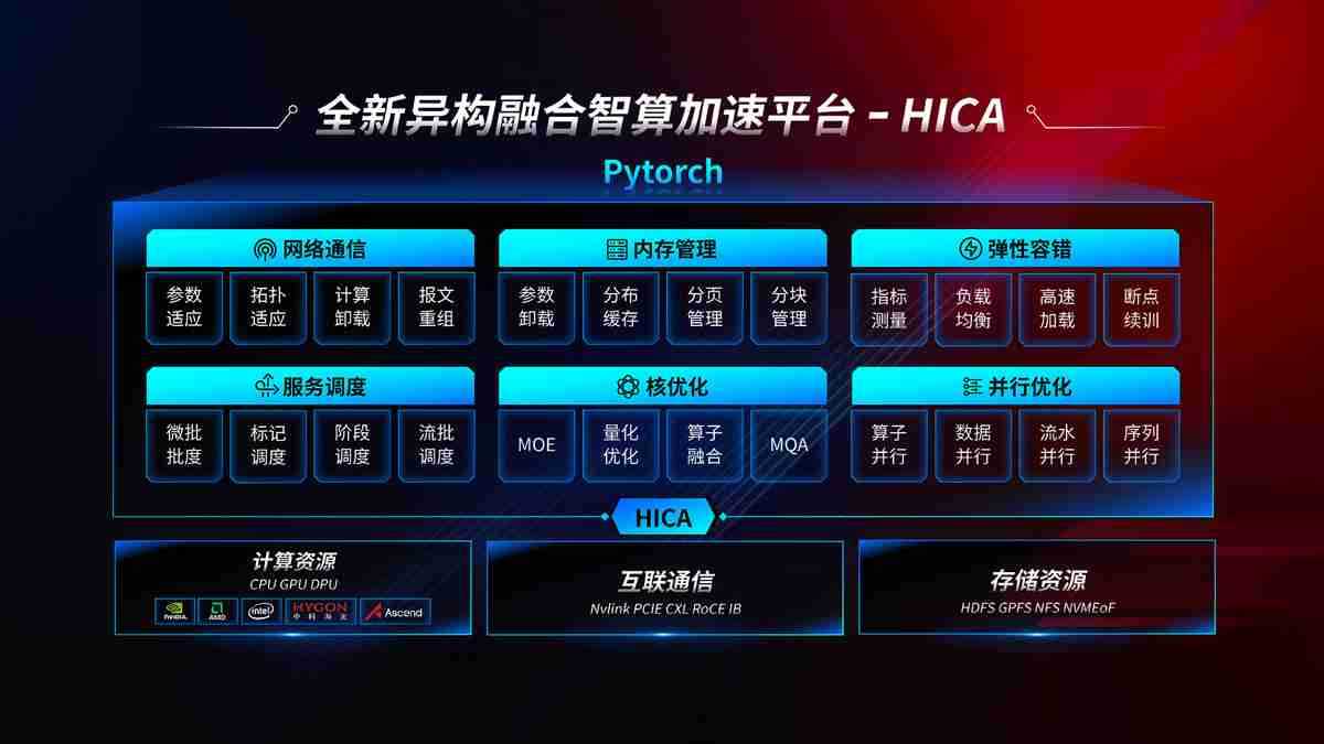 通过自研的服务层、、、中间适配层、、、、以及调度编排算法,,采用数据并行、、、模型并行等多种并行方式,,把并行计算任务进行有效的分解,,,,使其分别由相应的软件栈和算力资源来承接。。。当GPU资源变化,,HICA可以实时动态调度计算子任务并调整模型拓扑和架构,,,,以充分聚合各种算力资源。。。