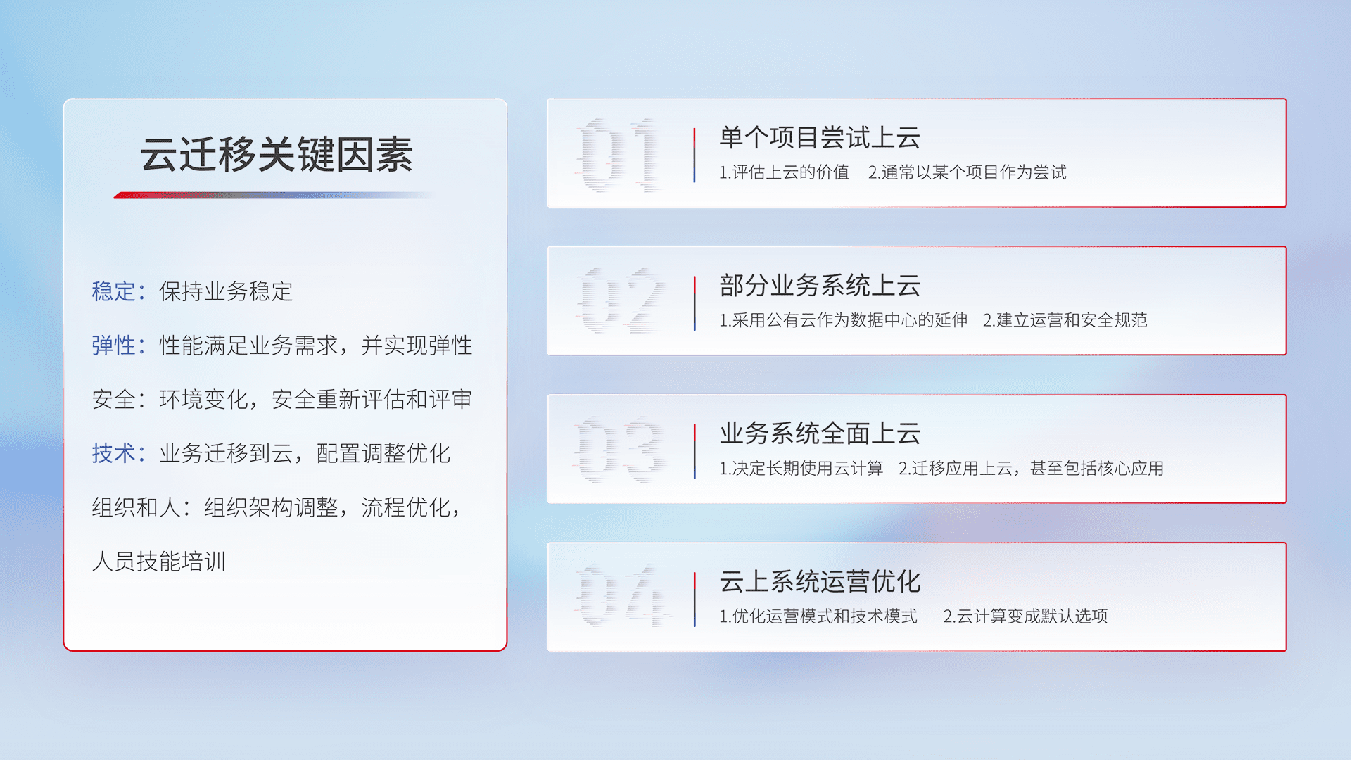 结合实际业务,,,,从规划设计、、云平台选型、、、云原生改造、、数据迁移、、、、集成交付,,,迁移全过程为客户识别最佳上云路径,,,做好风险识别管理,,,,设计网络架构、、、身份权限、、、、安全审计合规、、、、操作审计、、日志审计、、、监控告警策略、、、、多站点容灾设计等,,对云上基础设施进行整体规划,,,,提升IT治理水平,,以满足弹性、、、、高可用、、高性能的需求。。。。