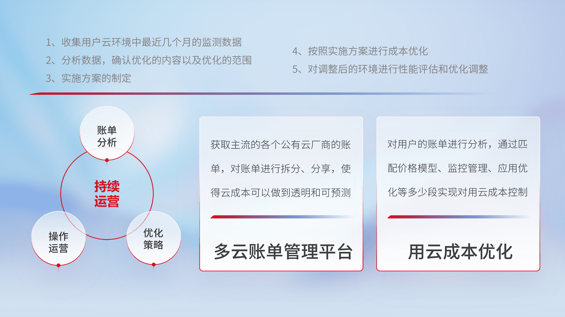 通过多云纳管,,以统一的资源数据模型把客户的云资源进行抽象和封装,,,进而实现对多云资源的统一操作,,保障云资源管理的可靠性、、、、稳定性与可用性。。。。量身定制化运维内容,,,配置、、、、开发运维、、补丁管理、、、备份、、、、监控、、认证和访问管理、、、、审计和日常巡检等,,,,保障在用云过程中的可靠度,,,,稳定度以及高可用率。。。。